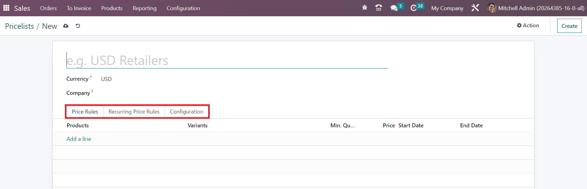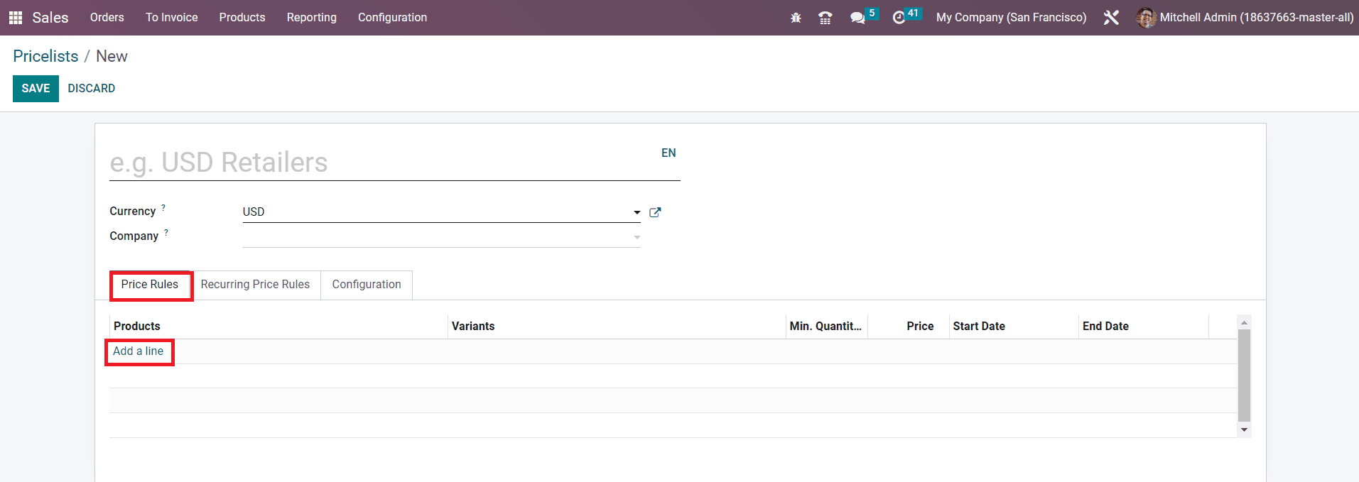 The configuration method is similar to that of the advanced price rule configuration. The only difference is that, under the Price Rule tab, you can add the list of products that you want to add to this pricelist using the Add a Line button.