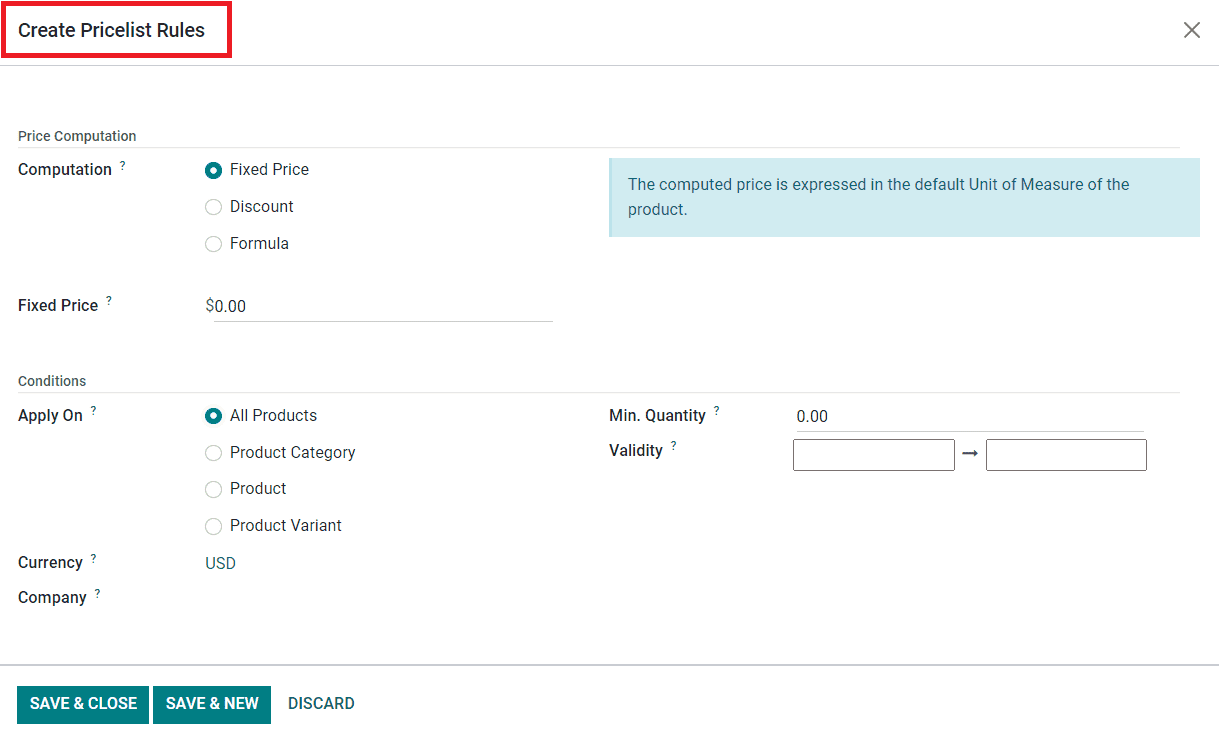 In the Price Computation field, you will get three computation methods to select such as Fixed Price, Discount, and Formula. Based on the option you select, additional fields will appear to specify details regarding the selected computation method. For example, if you select the Fixed Price option, you will get an extra field to specify the Fixed Price. Now, you can set the Conditions for the Pricelist Rules. You can apply this rule to All Products, or a particular Product Category, Product, and Product Variant based on the option you select in the Apply On field. Mention the Currency and Company in the corresponding fields. In order to apply this rule to a product, the bought/sold quantity must be greater than or equal to the quantity mentioned in the Minimum Quantity field. Finally, mention the starting and ending date of this pricelist rule in the Validity field. Click the Save button to add the new rule to your pricelist. In case the company wants to add more rules to the pricelist, you can use the Save & New button.