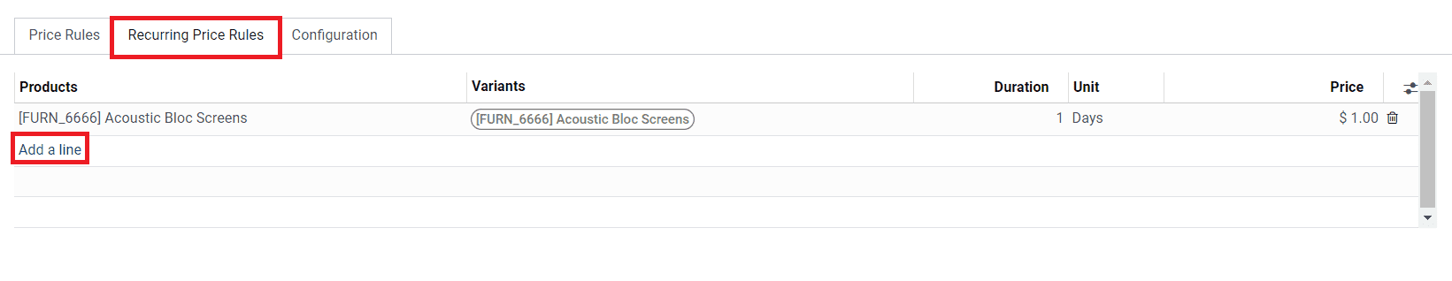 You can recur this price rule by mentioning the products in the Recurring Price Rules tab. Using the Add a Line button, you are allowed to select the product on which this pricing will be applied along with its variants. The minimum duration before this rule will be applied to the selected product can be specified in the Duration field. The duration can be specified in hours, days, weeks, months, or years based on the option you select in the Unit field.