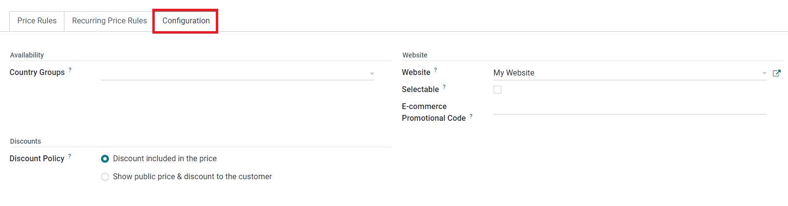 Now, you can move to the Configuration tab where you can find the Availability Discount and Website field to complete. In the Availability field, you can mention the Country Groups where this pricelist is available. You can set the Discount Policy as ‘Discount included in the price’ or ‘Show public price & discount to the customer’ in the Discounts field based on your company policies. In the Website field, specify the Website and eCommerce Promotional Code to use this pricelist on eCommerce. The user can choose this pricelist by activating the Selectable field. After completing all necessary fields, you can use the Save button.