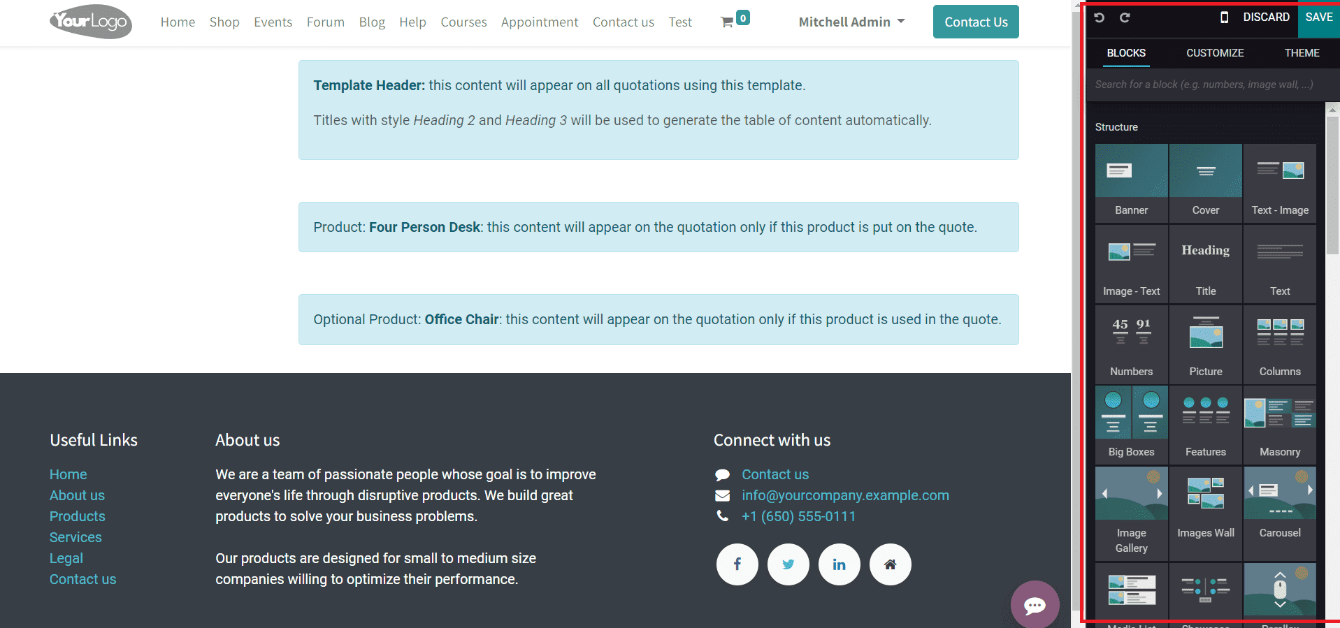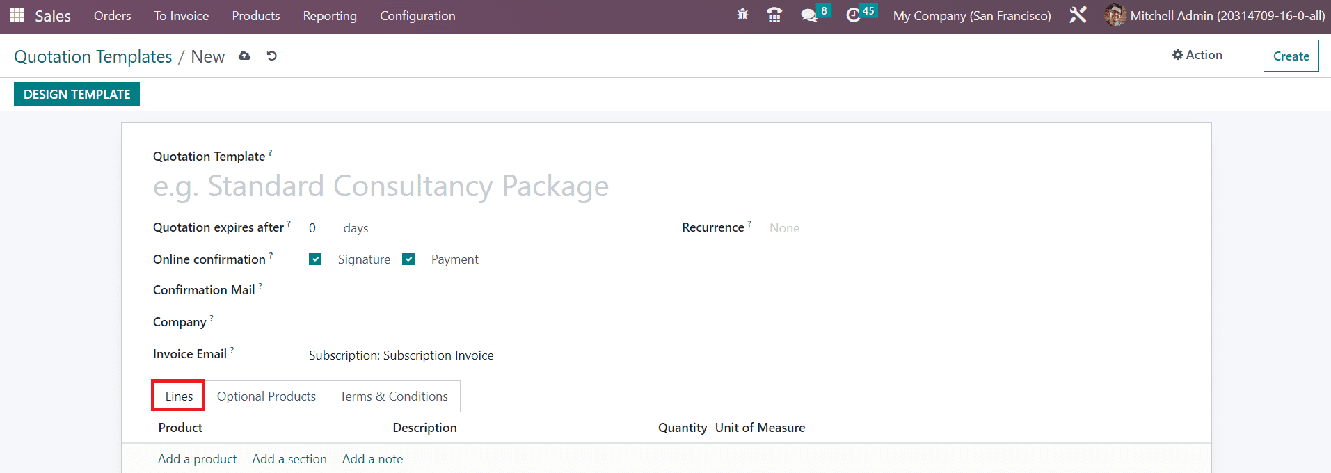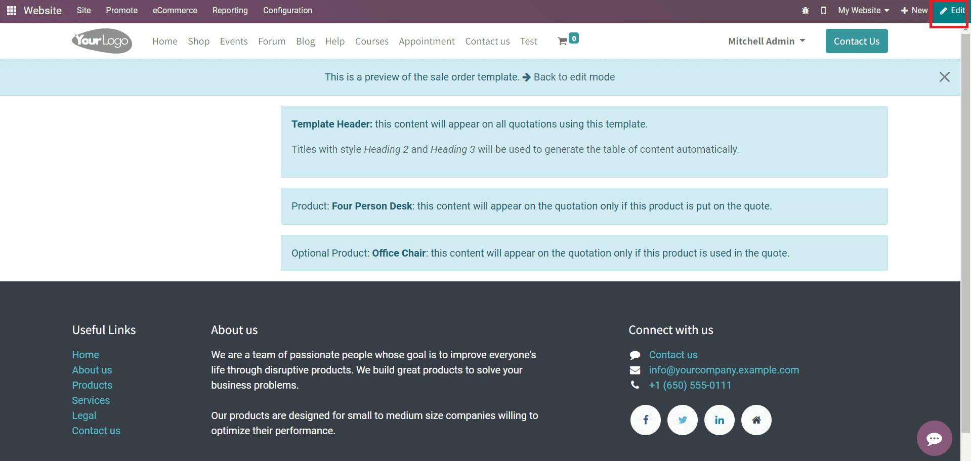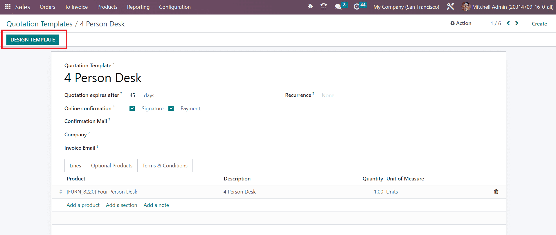 If you want to design the newly created quotation template, you can click on the Design Template button. This will lead you to the Odoo Website where you can enhance the preview of the quotation using advanced building blocks.