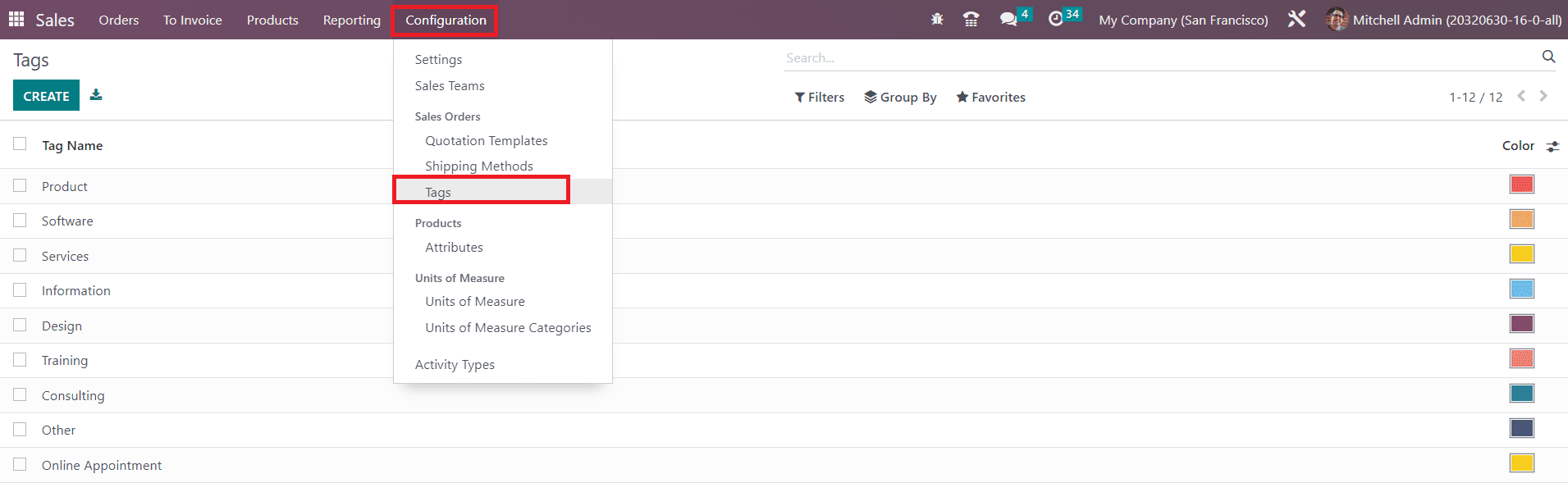 Adding tags to the operations while saving them in your database will always help you to easily retrieve the data when required. Odoo allows you to filter the configured operations based on the tags added to them. In the Odoo Sales module, you can configure such sales tags for the sales operations effortlessly from the Configuration menu of the module. As shown in the image below, you will get access to the Sales Tags platform from the Configuration menu.