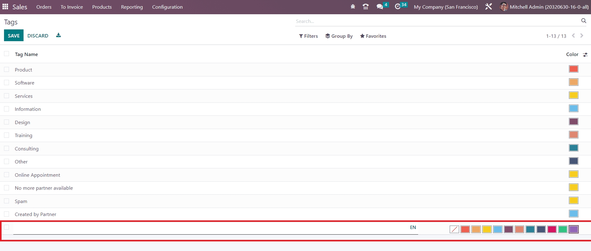 Clicking on the Create button will give a new line under the existing list of tags where you can mention the name of your new sales tag and select a suitable color for the tag. Use the Save button to add the new tag to the list.