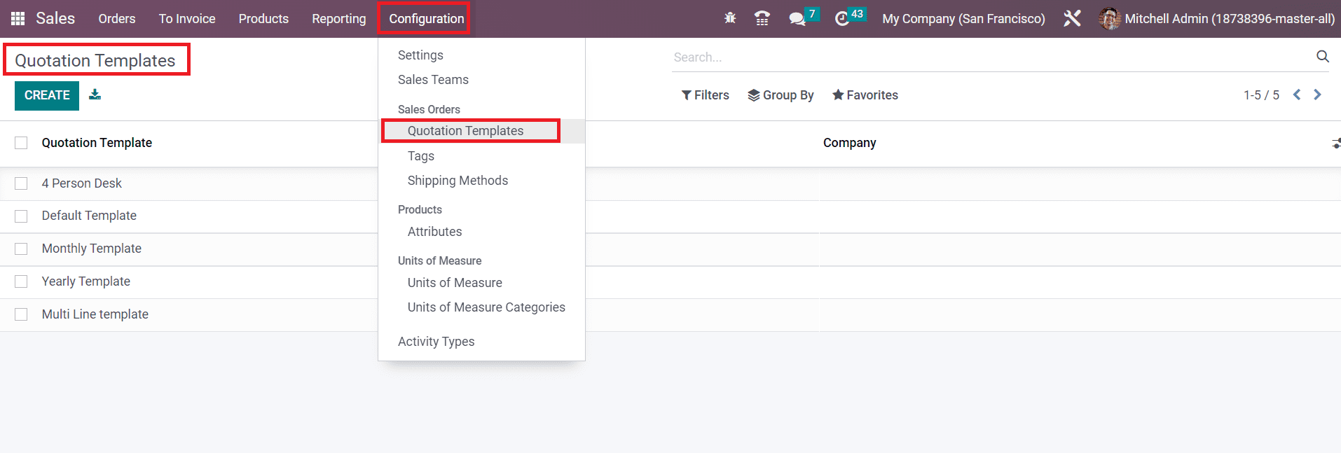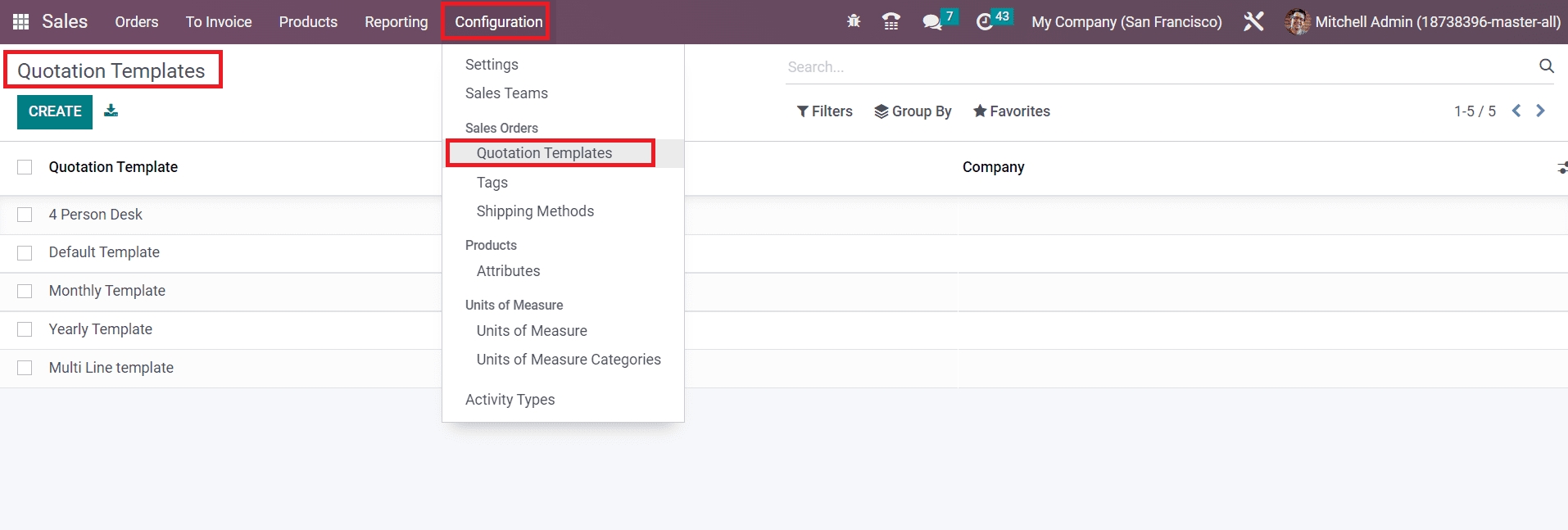 The option to configure new Quotation Templates can be seen under the Configuration menu of the module.