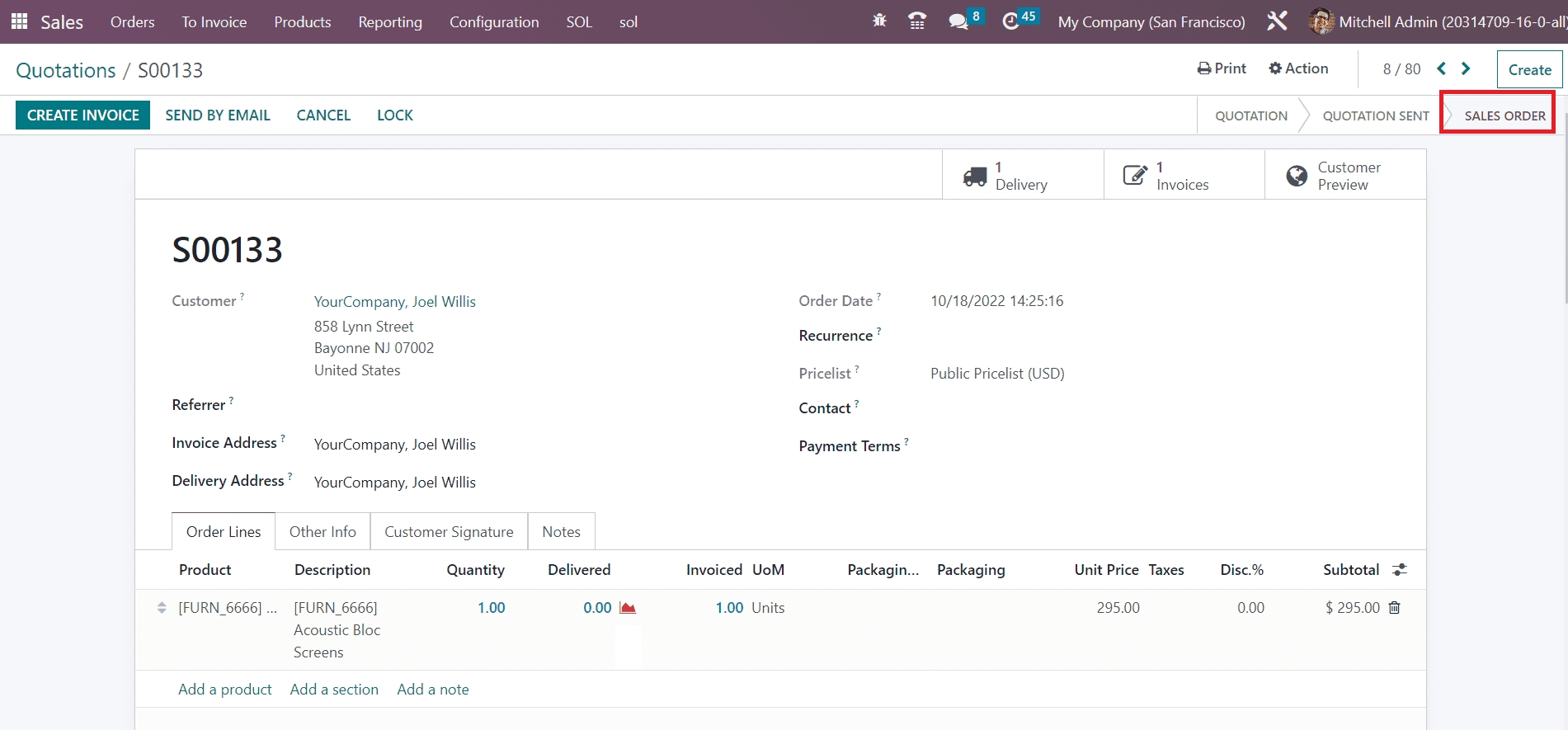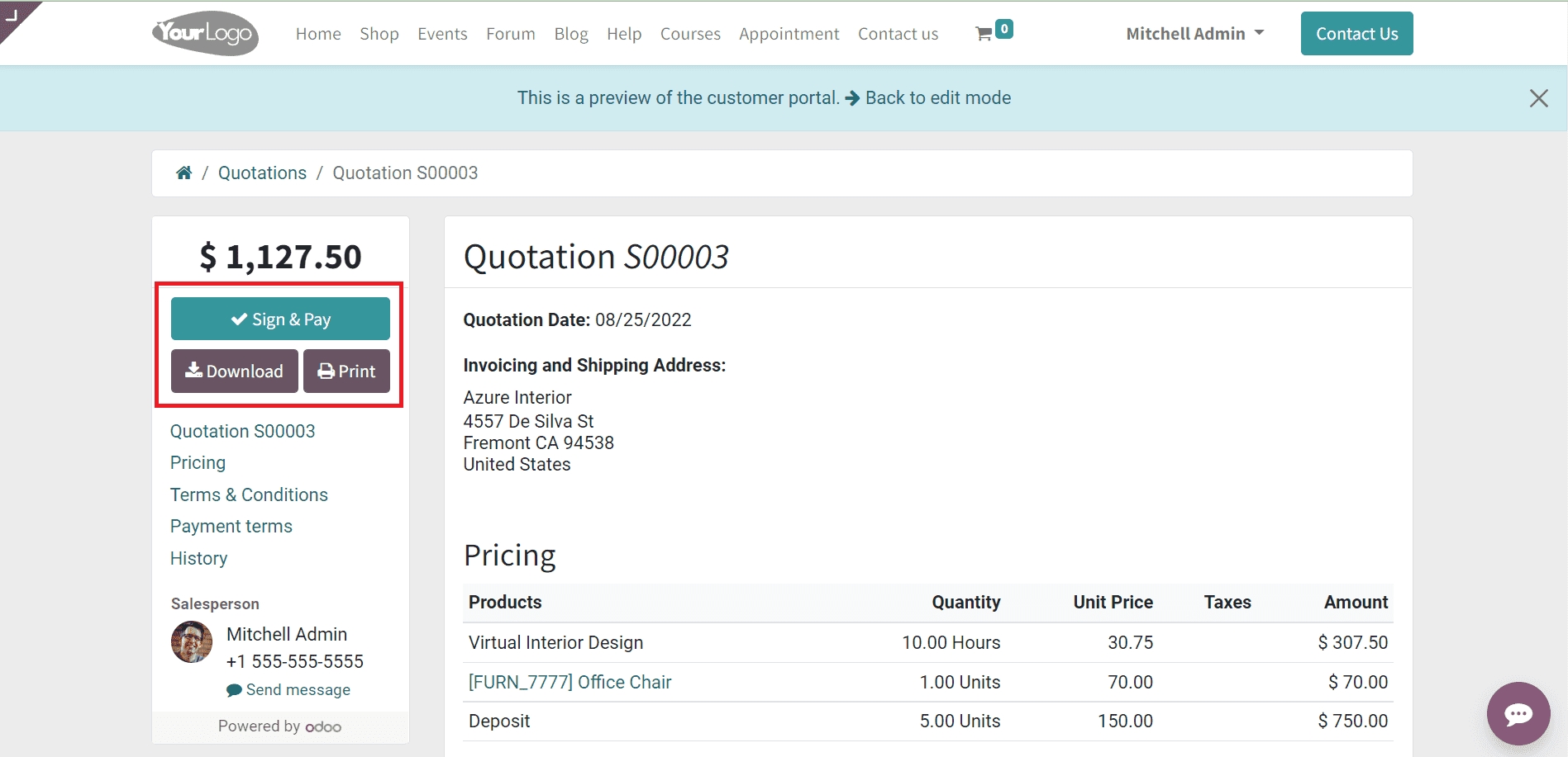 Once the customer confirms the quotation, it will be automatically converted into a sales order. From the customer portal, the customer can confirm the quotation by clicking on the Sign & Pay button.