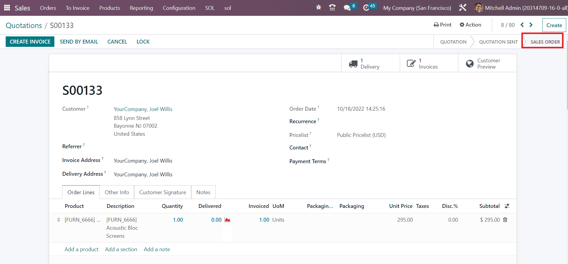 Now, you can click on the Confirm button. By clicking the Confirm button the status of the quotation will be changed to Sales Order as shown in the image below.