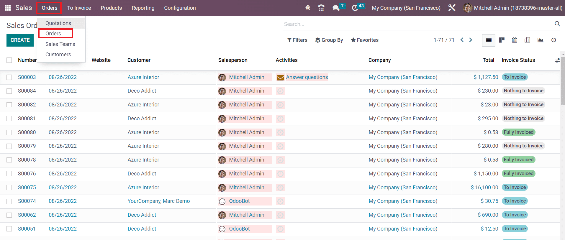 The list view of this platform will show the details of the Sales Order Number, Order Date, Website, Customer, Salesperson, Activities, Company, Total, and Invoice Status. Odoo offers List, Kanban, Calendar, Pivot, Graph, and Activity views for this platform. The Filters and Group By options will help you to simplify the searching procedures with default as well as customizable options.