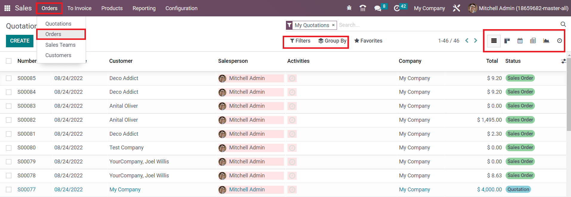 The preview includes Quotation Number, Creation Date, Customer, Salesperson, Activities, Company, Total, and Status of each quotation. Using the small clock icon given on the Activities field, you can schedule various activities with the respective customers. Apart from the list view, Odoo provides Kanban, Calendar, Pivot, Graph, and Activity views for this platform. Using the customizable and default sorting options you can filter and group the quotations as per your requirements.