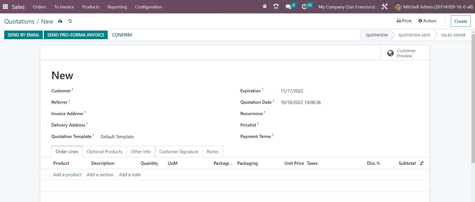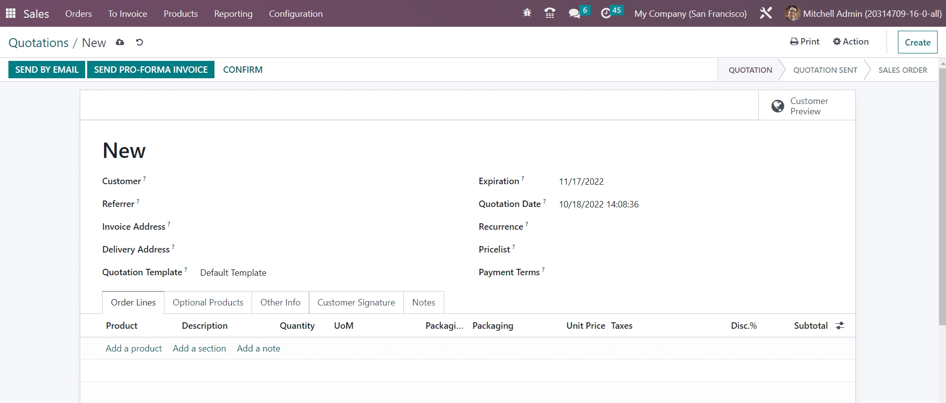 Let’s take a look at the creation of a new sales quotation. For this, you can click on the Create button which will direct you to a new quotation creation window as depicted below.