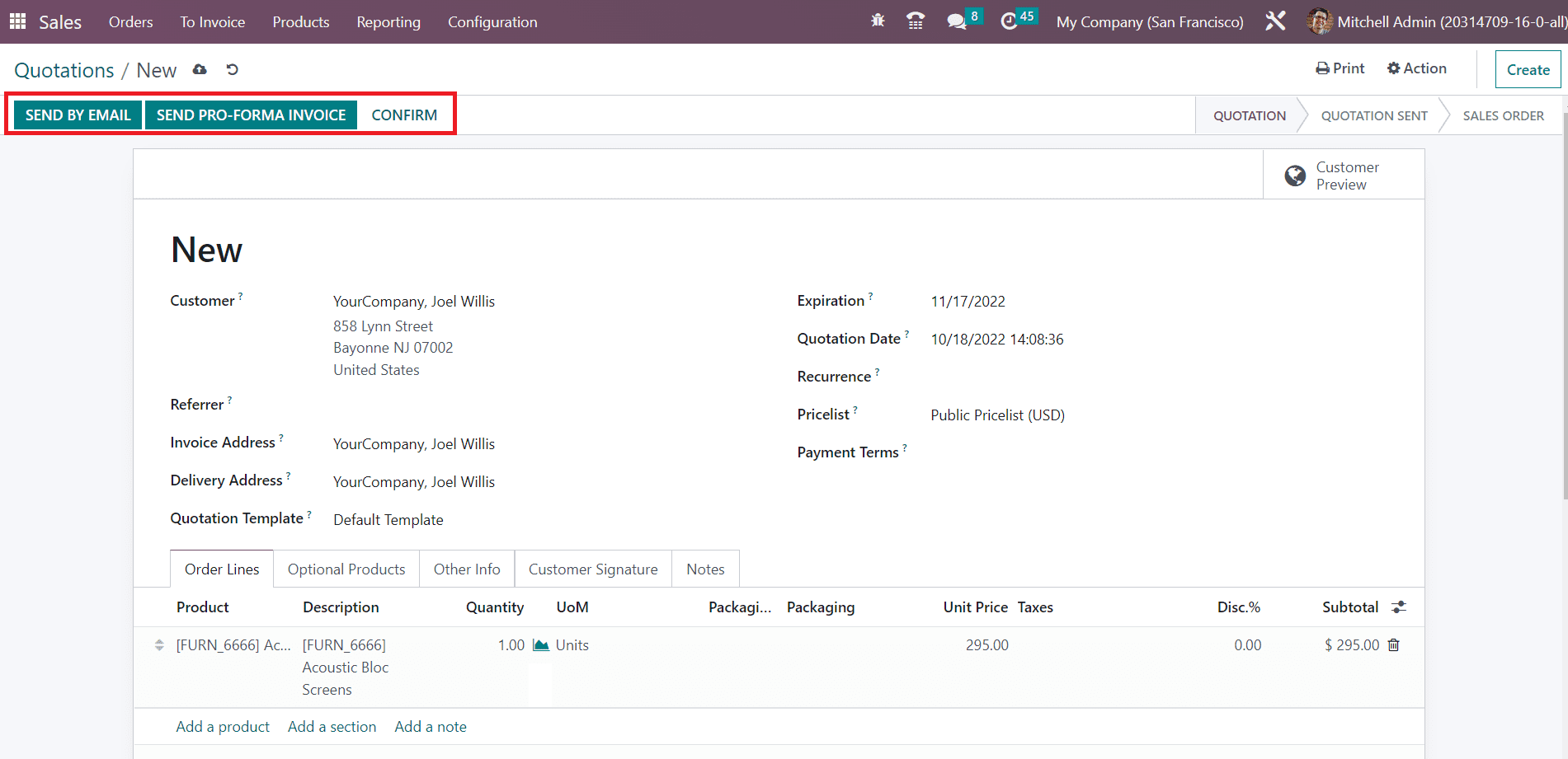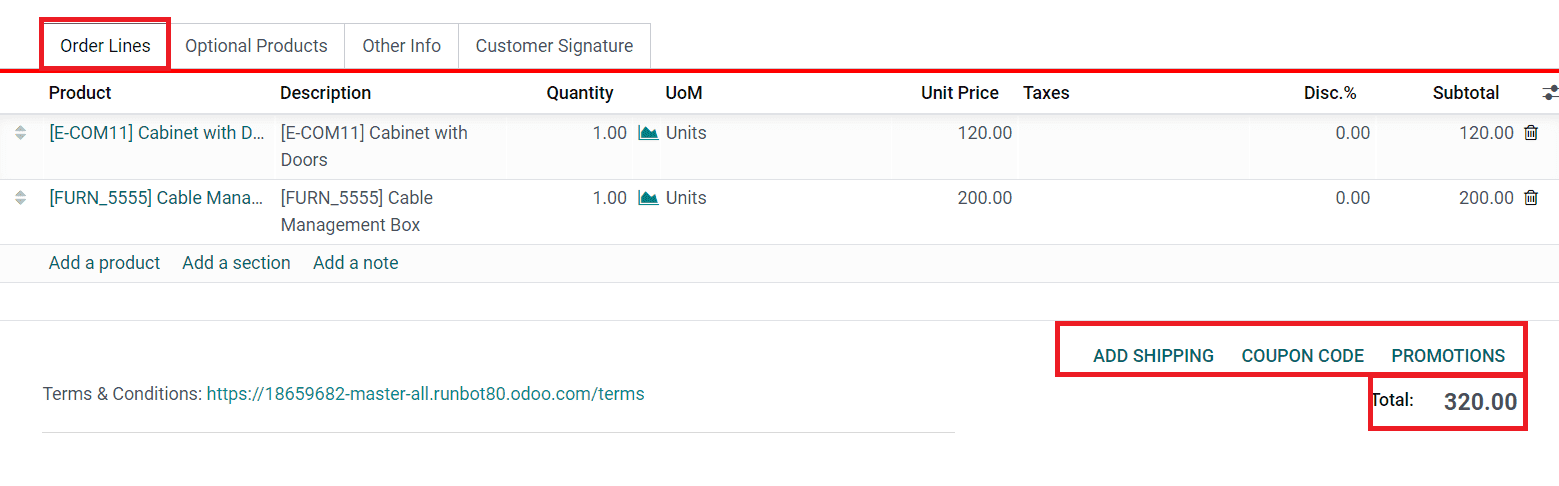 Now, under the Order Line, you can add the products that you want to offer to your customer. Using the Add a Line button, you can specify the Product, Description, Quantity, UoM, Unit Price, Taxes, Discount, and SubTotal. You can add as many as products in this section based on the customer’s requirement. After adding products, you will get the Total amount of the order in the Order Line as highlighted in the image below.