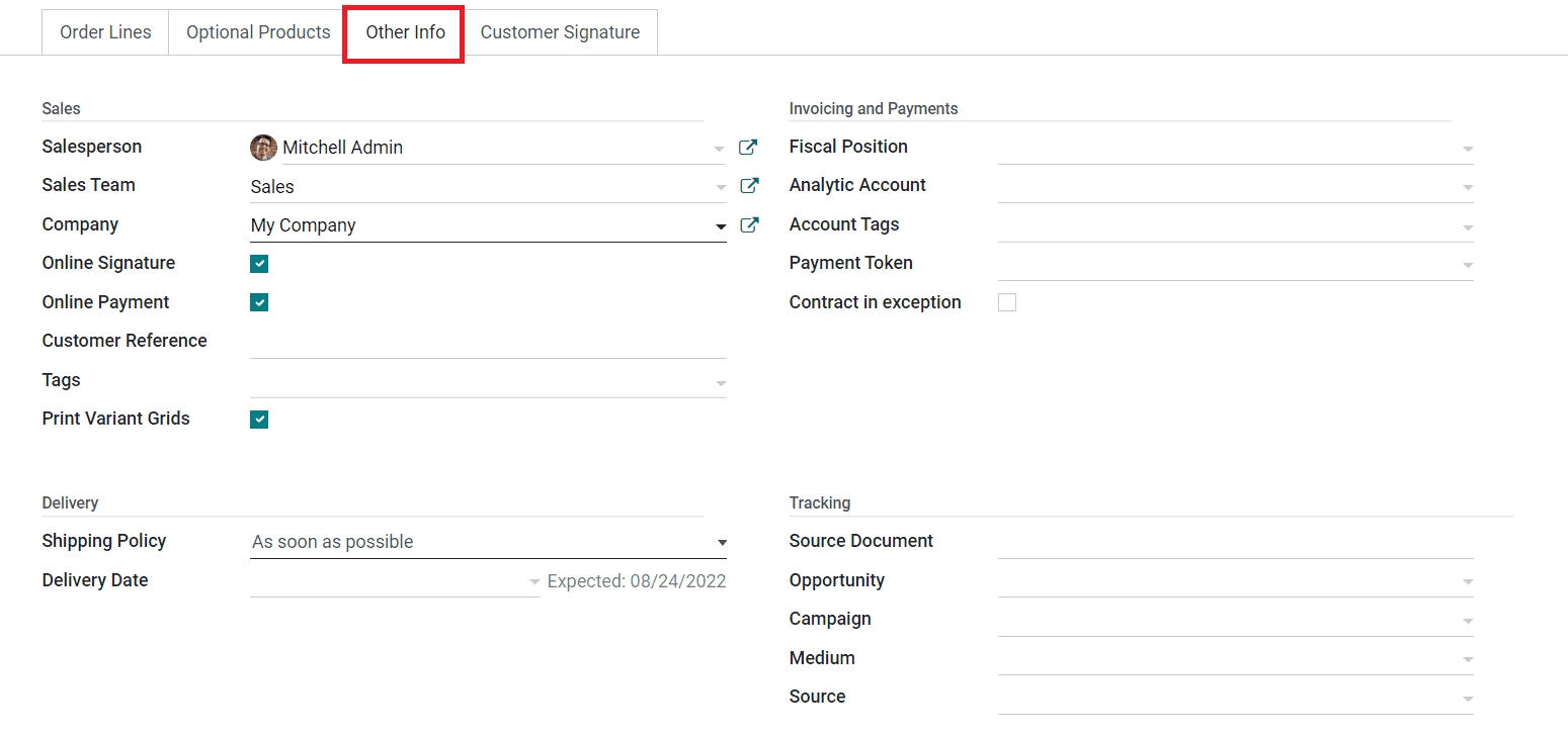 The Other Information tab in the quotation can be used to mention the Sales, Delivery, Tracking, Invoice, and Payment details.