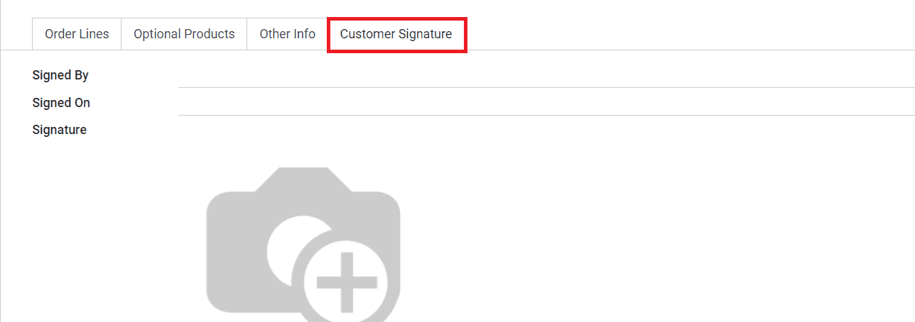 Once you activate the Online Signature feature from the Other Information tab for the customer to sign the quotation online, Odoo will provide an additional tab in the quotation window as shown below to record the details of the Customer Signature.