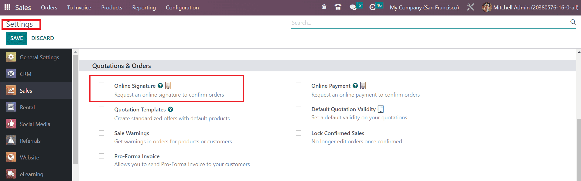 If you want to make the Online Signature feature available for all sales orders, you can go to the Settings menu of the Sales module and activate the Online Signature option.