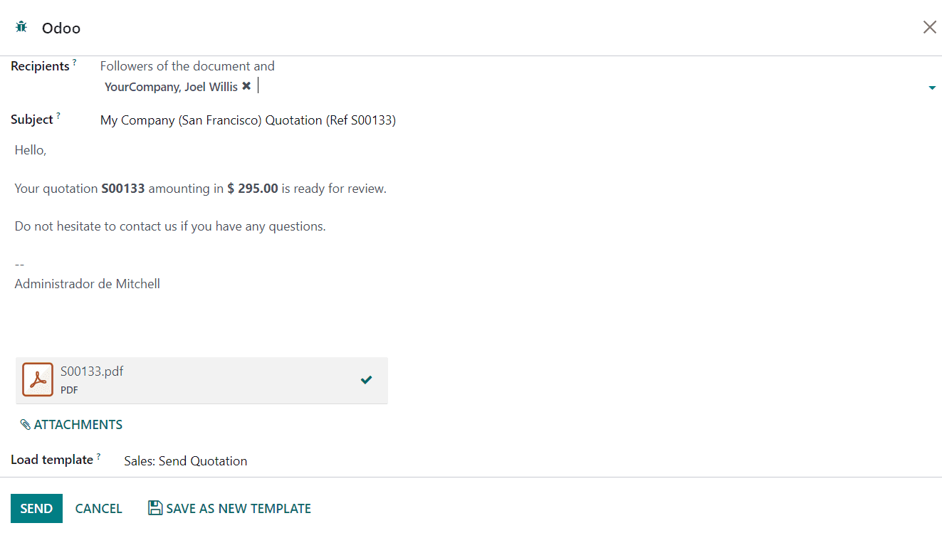 When you click on the Send By Email button, Odoo will automatically generate an email with the quotation as an attachment as shown in the image below.