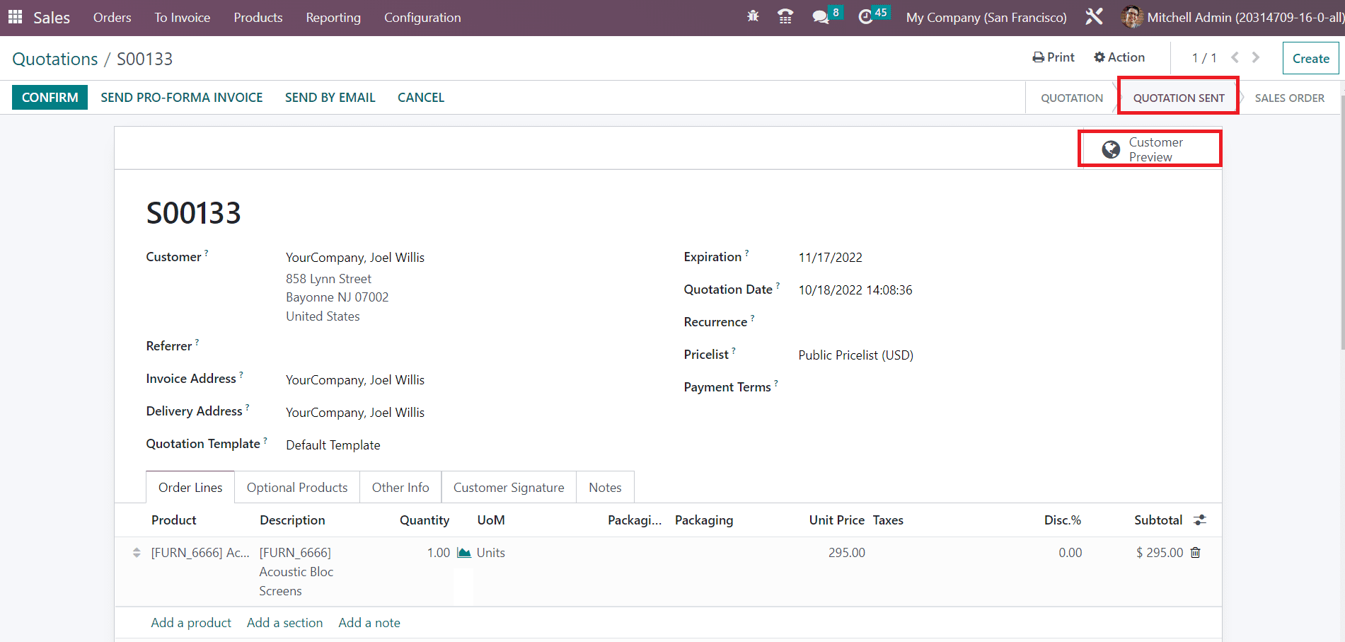 The Customer Preview button will provide you with the website view of the quotation. This is the preview of the customer portal where the customer can conveniently view the quotation and confirm it.