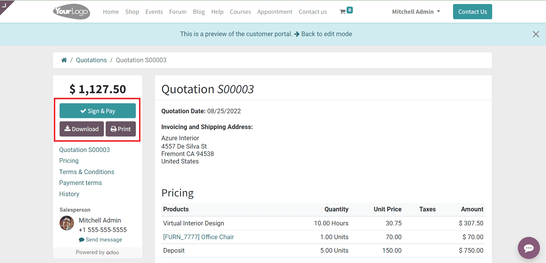 Using the Sign & Pay button, the concerned customer can effortlessly sign and pay the quotation digitally. The Download and Print buttons can be used for downloading and taking printouts of the quotation respectively. The Feedback button will assist the customer to send feedback. The customer can use the Reject button to reject the quotation if they don’t want to move forward with this sales deal.