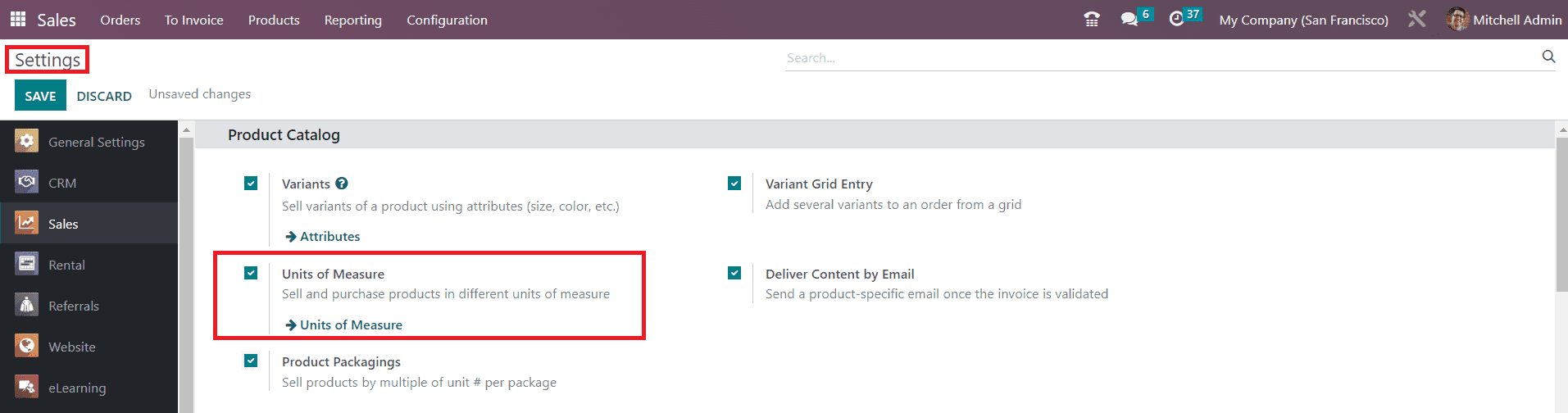 Configuring units of measure is essential to measure the quantities of the products configured in your database. When purchasing and selling products, you need to depend on different types of measures. You can easily configure such units of measure in the Odoo Sales module. To get this feature, you can go to the Settings menu.