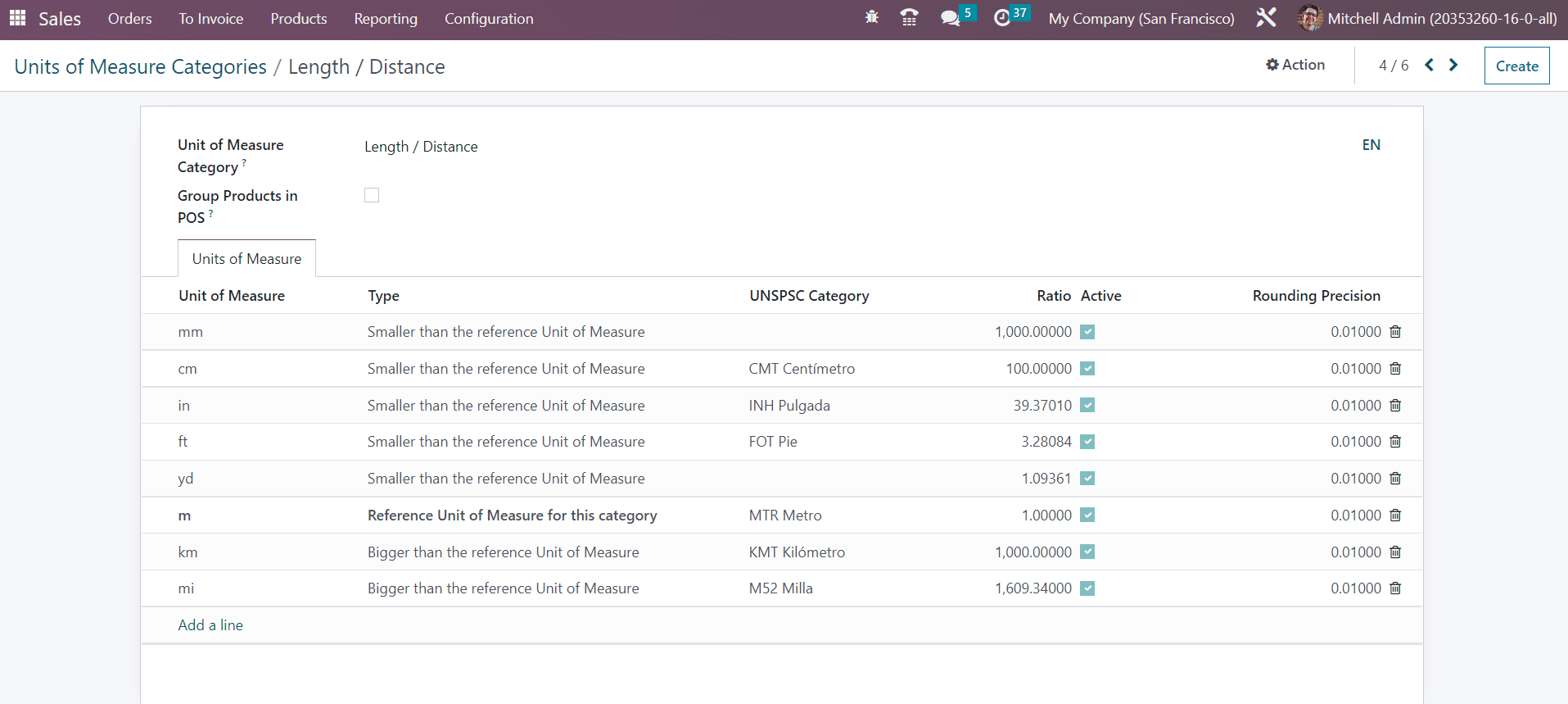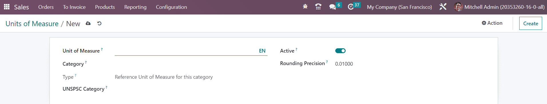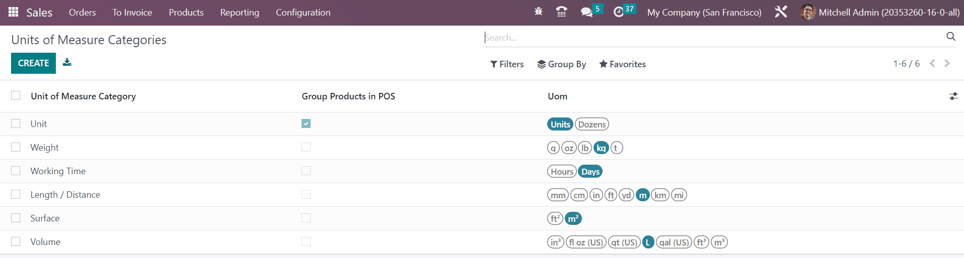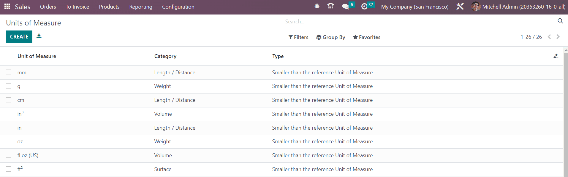 The list will show already configured Units of Measure with the details of the respective category and type. Using the Create button, you can create a new UoM.